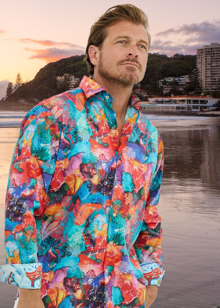 From a borrowed Kombi van to a bold Australian menswear brand, his designs blend premium European fabrics with coastal colour and effortless comfort.