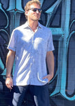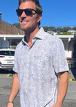Our Capri Shirt white floral is your perfect travel companion, crafted from 100% viscose woven exclusively in Europe just for us. This shirt feels wonderfully cool and light, keeping you comfortable no matter where your adventures take you. Its navy abstract print adds a splash of playful style, while the chest pocket and flat edge hem give it a casual yet polished look. Whether you're exploring new cities or dressing up for a special occasion, this shirt effortlessly blends comfort and flair, making it a standout piece in your travel and everyday wardrobe.