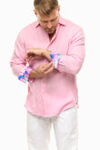 Paradise awakened! Endless miles of crystal clear aqua blue waters, Lanikai Beach in Hawaii is one of David's favorite places to be. Discover one of the best pale pink linen shirts for men, a David Smith's luxury linen shirt not only breathes as you wear it but gets softer over time. , Bold floral trims complement this beautiful stylish flamingo men's linen shirt.