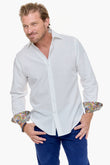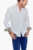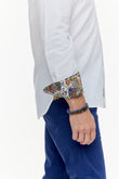 The pure white fabric is elevated with vibrant floral contrast trims inside the cuffs, adding a lively burst of colour whenever the sleeves are rolled. Versatile, polished, and perfect for holidays, long lunches, or evenings out, this shirt brings coastal ease and timeless appeal to your wardrobe.