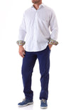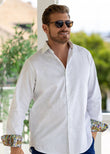 This high-end men's shirt showcases a subtle paisley motif in white. Upon further examination, the design almost appears embossed, bringing it beyond a standard collared shirt. The cuffs feature our signature paisley design, adding a hint of style to this long-sleeve collared shirt in white Perfect for any event, this 100% deluxe Supima Cotton shirt pairs well with our Memphis Sand pants or our Conrod Jeans for a sophisticated and polished ensemble.