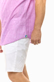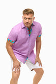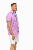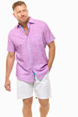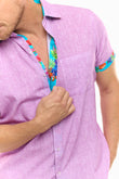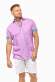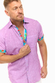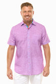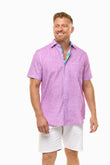 Pure David Smith genius: Silcott. The Cayman Shirt is the ultimate iris purple short-sleeve shirt you will love to wear. Crafted from 100% cotton, uniquely woven in an open weave, it has the look of linen and the luxurious feel of lounging silk. A chest pocket and contrasting floral trims on cuffs and collar complete the look, making it the perfect casual shirt for men.