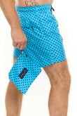 Float away wearing these tropical swim shorts. David Smith swim shorts with the added bonus of a pocket bag to keep your cruise aqua and navy blue spot swim shorts in or all your essentials when out for a swim. Keep a pair in your car for that ultimate spur-of-the-moment getaway or adventure. Quick-drying and soft to touch as well as being comfortable and lightweight. Quick-drying swim fabrication, elasticated waistband with drawstring, side pockets, velcro tab back pocket, and Internal mesh briefs.