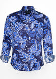 Expertly designed by Australian fashion icon David Smith, this Blue Paisley Shirt features bold paisley print on navy blue background. Made from the finest Supima Cotton, this luxurious button-up shirt is perfect for adding a touch of flair to any outfit, whether you're dressing up for a special occasion or dressing down for a casual outing. With its long sleeves, this men's shirt is sure to make a statement wherever you go.