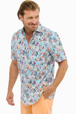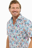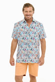 Its vibrant mosaic of tropical leaves, abstract shapes and hand-drawn textures creates a lively, multi-coloured print that feels relaxed, playful and unmistakably David Smith. Finished with a chest pocket, short sleeves and signature contrast trims, it’s the perfect shirt for summer holidays, long lunches and everyday standout style.